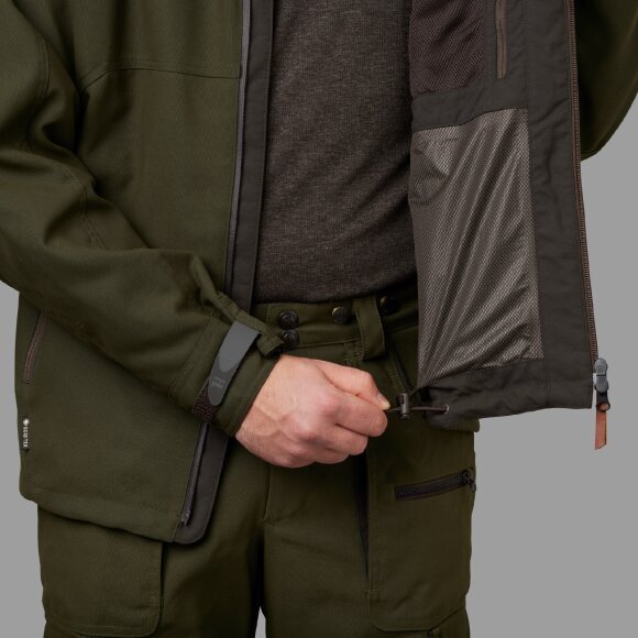 Med en skjult radiolomme på brystet og rummelige frontlommer med lynlås har du plads til dine jagtessentielle. Indvendigt tilbyder jakken praktiske lommer til pung, jagttegn og mobiltelefon. Den integrerede hætte kan justeres efter behov, og velcrobånd ved manchetterne og elastisk snoretræk i bunden sikrer en tæt pasform.