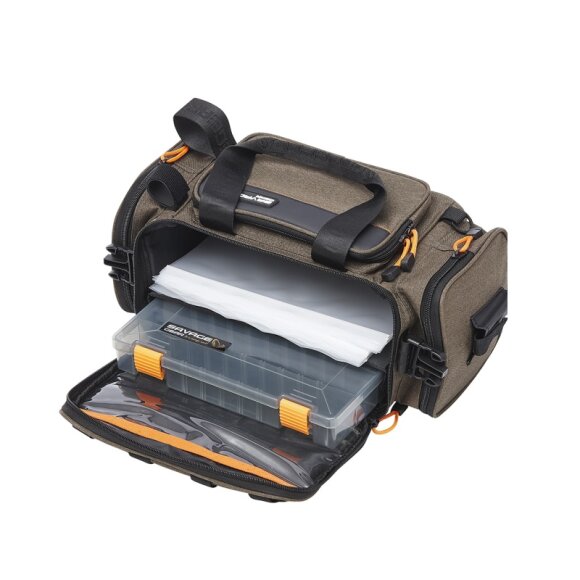 Den medfølgende grejboks er produceret i røgfarvet PP-materiale med UV-beskyttelse, hvilket beskytter dit grej mod sollys og forlænger levetiden på dine agn. Sammen med boksen medfølger 10 PE-poser, som er perfekte til opbevaring af gummiagn, små dele og løst grej, så alt holdes adskilt og organiseret. Kombinationen af fleksibel opbevaring og kompakt format gør denne Savage Gear taske til et oplagt valg for den organiserede lystfisker.