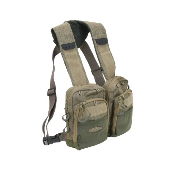De to separate frontmoduler kan forbindes med lynlås eller elastisk webbing, afhængig af hvor tæt du ønsker pasformen. De velpolstrede og fuldt justerbare skulderstropper sikrer komfort hele dagen og har velcro-overflader til montering af aftagelige tilbehørsholdere. Hvert hovedrum rummer 1-2 store flueæsker, mens de mindre lommer er perfekte til forfang, tippet og andet vigtigt udstyr. Bagsiden har en praktisk D-ring eller clips til landingsnet, så det altid er lige ved hånden.